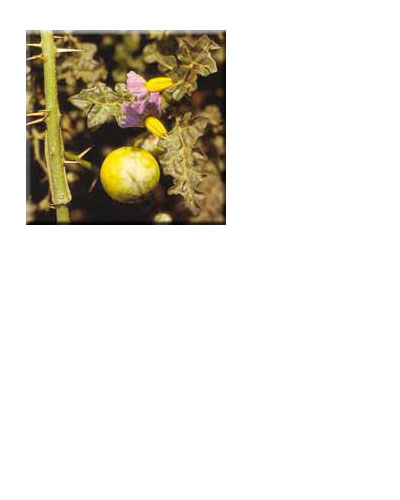 Fruits eaten as an anthelmintic and for indigestion. Root is an expectorant, used in Ayurvedic medicine for cough, asthma, chest pain. Also used for flatulence, sore throat, and toothache. Has high concentration of solasodine, a starting material for the manufacture of cortisone and sex hormones. It cures asthma, cough, bronchspasm, sore throat, constipation, an effective expectorant and diuretic. Bhavamisra, an ancient physician, mentions it as promoting conception in females. Given with honey, tulsi (Ocimum sanctum), datura (Datura metal), and black pepper it can be effective in cases of bronchial asthma. Kantkari (Solanum Xantho-carpum) is one of the members of the dasamula (ten root) of the Ayurveda. It is a very spiny diffuse herb up to 1.2 m tall, commonly found throughout India. The juice of berries is used in sore throat. Roots and seeds are administered as an expectorant in asthma and cough and pain in chest. Stem flowers and fruits are bitter and carminative and are prescribed for relief in burning sensation in the feet. Leaves are applied locally to relieve pain. The drug is collected mainly from the wild plants, as there is no systematic cultivation of the herb. They are 3-5cm long and 1.6-6 mm thick, dull grayish in colour with a soft fibrous structure. Pharmacological studies on this herb have shown that aqueous and alcoholic extracts of the plant possess hypotensive effect, which is partly inhibited by atropine (The Wealth of India). The herb is known as Kantakari and Nidigadhika in Sanskrit, in Hindi it is known as Kateli, Katai and Ringani, in Bengali Kantakari, in Marwari Bhuiringani, in Gujarati Bhoyaringani, in Telugu Pinnamulaka, Nelamulaka and Vankuda, in Tamil and Malayalam Kandankattiri, in Oriya Bhejibegun and Ankranti. In Punjab it is known as Kandyali, Mahori and Warumba and in Bihar Rengnie, Bhat-khataya and Rangaini Janum. English name is yellow berried nightshade. A total of four patents have been located; two patents granted in US, one in Russia and one application filed in India. Description: Kantkari (Solanum Xantho-carpum) is one of the members of the dasamula (ten root) of the Ayurveda. It is a very spiny diffuse herb up to 1.2 m tall, commonly found throughout India. The juice of berries is used in sore throat. Roots and seeds are administered as an expectorant in asthma and cough and pain in chest. Stem flowers and fruits are bitter and carminative and are prescribed for relief in burning sensation in the feet. Leaves are applied locally to relieve pain. The drug is collected mainly from the wild plants, as there is no systematic cultivation of the herb. They are 3-5cm long and 1.6-6 mm thick, dull grayish in colour with a soft fibrous structure. Pharmacological studies on this herb have shown that aqueous and alcoholic extracts of the plant possess hypotensive effect, which is partly inhibited by atropine (The Wealth of India). The herb is known as Kantakari and Nidigadhika in Sanskrit, in Hindi it is known as Kateli, Katai and Ringani, in Bengali Kantakari, in Marwari Bhuiringani, in Gujarati Bhoyaringani, in Telugu Pinnamulaka, Nelamulaka and Vankuda, in Tamil and Malayalam Kandankattiri, in Oriya Bhejibegun and Ankranti. In Punjab it is known as Kandyali, Mahori and Warumba and in Bihar Rengnie, Bhat-khataya and Rangaini Janum. English name is yellow berried nightshade.
