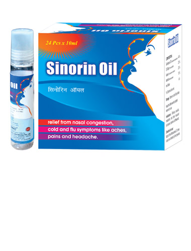 SINORIN OIL roller releases a controlled amount of Oil effective in Rhinitis, sinusitis and headache. Liberal application of the oil provides relief in nasal and chest congestion. The formulation is also effective on muscular joint pains.